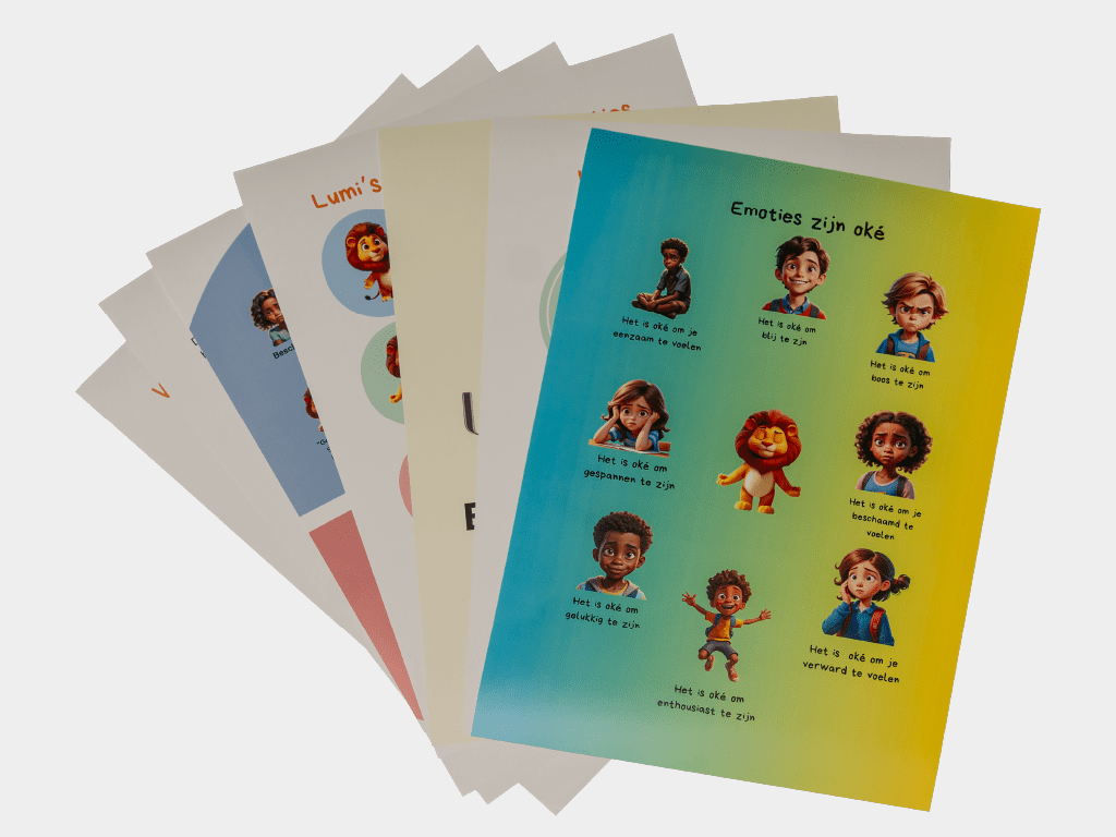 Elke poster is ontworpen om kinderen (4 t/m 12 jaar) op een toegankelijke en positieve manier te begeleiden bij hun emoties. De posters sluiten aan op de emotie- en kalmeringskaarten uit de LumiMood-toolkit en zijn afgestemd op de herkenbare LumiMood-stijl.