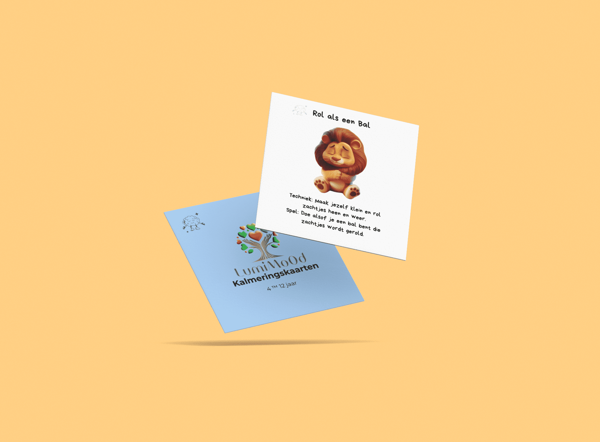Visuele instructiekaarten met rustgevende ademhalings- en lichaamsgerichte oefeningen.
